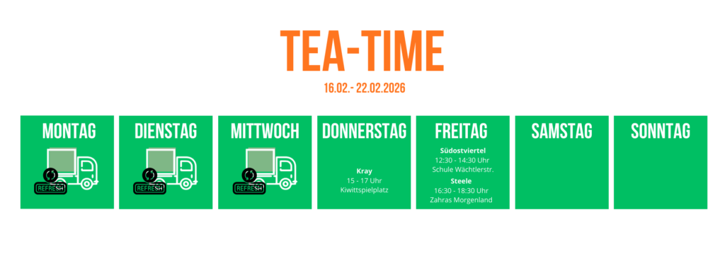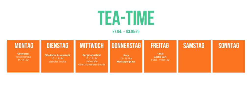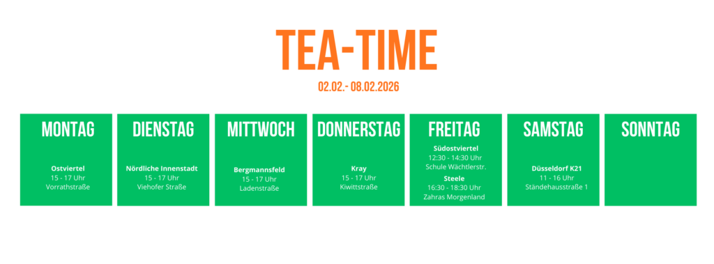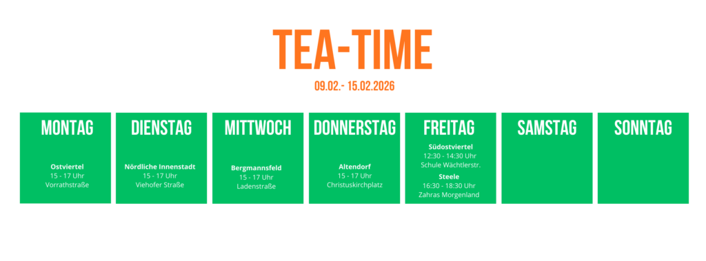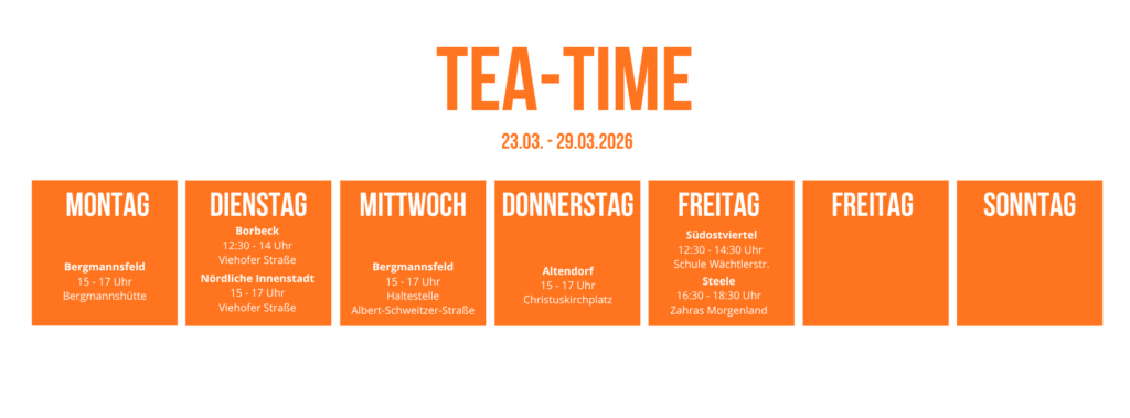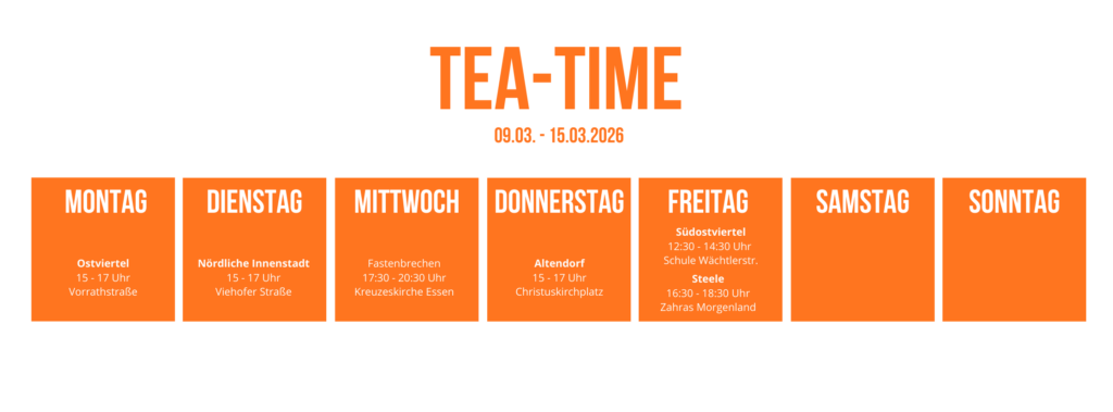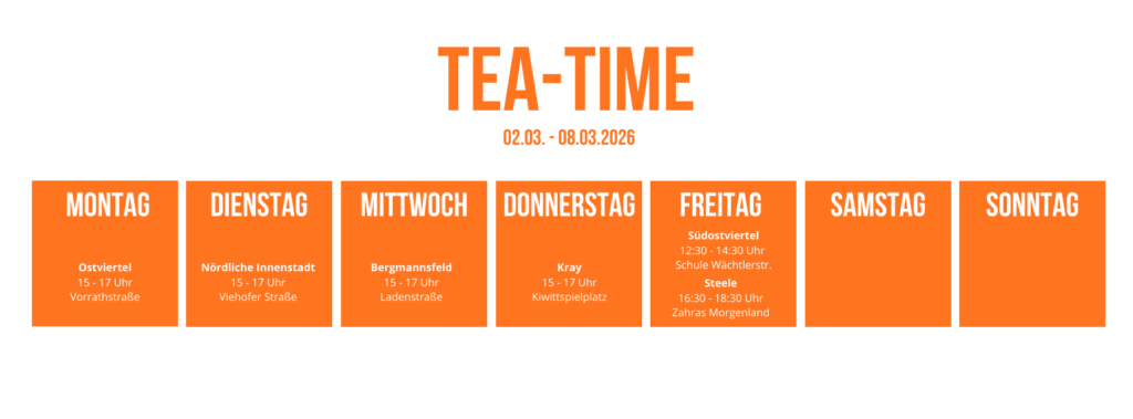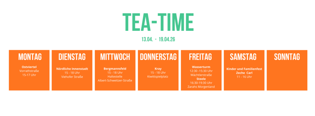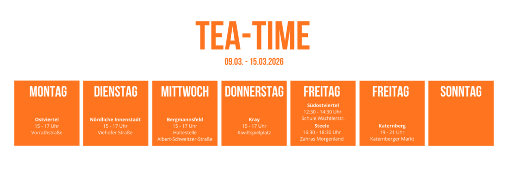 Teekulturen sind so vielfältig wie die Menschen im Ruhrgebiet. Also präsentieren wir euch die unterschiedlichsten Teetraditionen direkt vor Ort. So können wir noch etwas voneinander lernen und bei einer leckeren Tasse Tee lässt es sich viel einfacher ins Gespräch kommen.
