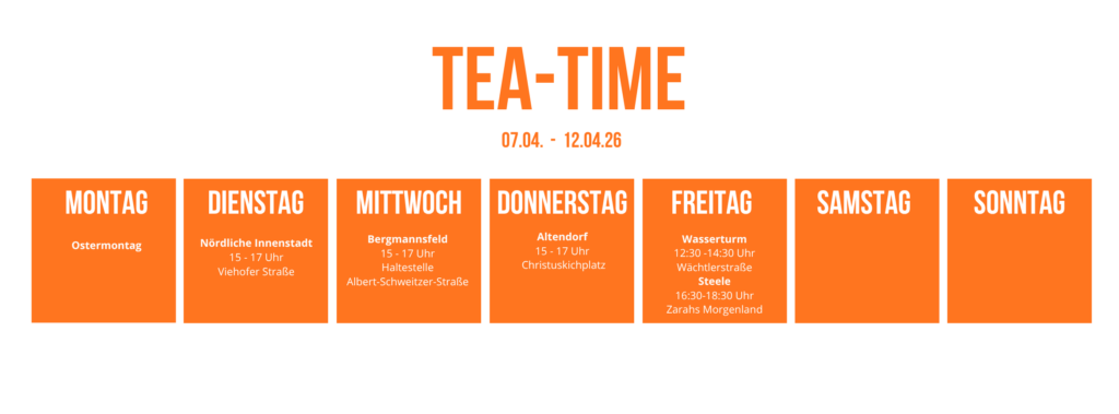Teekulturen sind so vielfältig wie die Menschen im Ruhrgebiet. Also präsentieren wir euch die unterschiedlichsten Teetraditionen direkt vor Ort. So können wir noch etwas voneinander lernen und bei einer leckeren Tasse Tee lässt es sich viel einfacher ins Gespräch kommen.